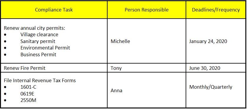- Define the routine. Establish the procedures needed for every compliance task especially for the more complicated ones (like income taxes). Document the routine with your team and include it in their performance measures;