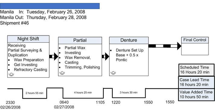 Followers of the Lean concept use Value-Stream Maps (VSMs) to show the lengths of time steps take during a process. The point is to show which process adds value (such as where there is transformation) and which does not (such as waiting, inspection, movement):