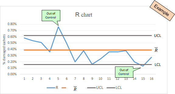 But the point of the control charts wasn’t just to indicate how many sachets are leaking. The control charts showed that the percentage of leaking sachets was averaging 7.4% to 7.8%. The range (R) chart illustrates this variation, as differences between items varied at an average of 0.4%. This meant daily damaged sachets kept to a steady range between 7% to 8% of total.