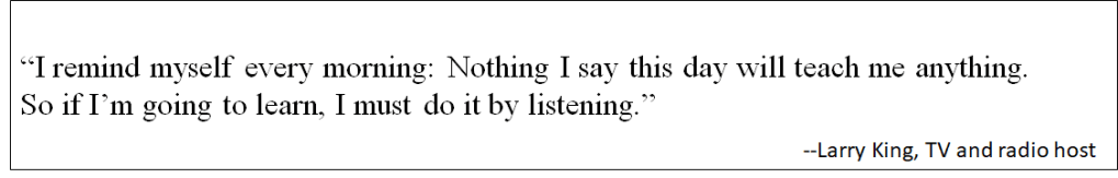 Listening builds trust and trust opens up communication which leads to information sharing and innovation. Innovation drives growth and competitive advantage. And it doesn’t cost a thing. Just some effort will do.