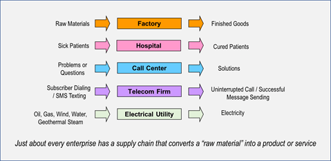 Supply chains follow the flow of products from their start as raw materials to their conversion to merchandise and subsequent delivery to users. Service and utility enterprises also follow a path of conversion and delivery not altogether different from product supply chains.