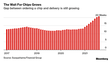 Bloomberg reported in its September 22, 2021 Supply Lines newsletter that the gap between “ordering a semiconductor chip and delivery is still growing.”