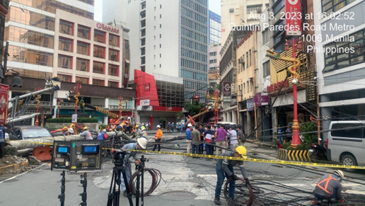 Eight (8) utility posts fell on a busy street at Manila’s Binondo Chinatown district. The posts damaged cars and caused a power failure to commercial establishments. The power utility company, MERALCO, however, immediately removed and replaced the fallen posts. Power was restored within hours. Business on the street returned to normal.