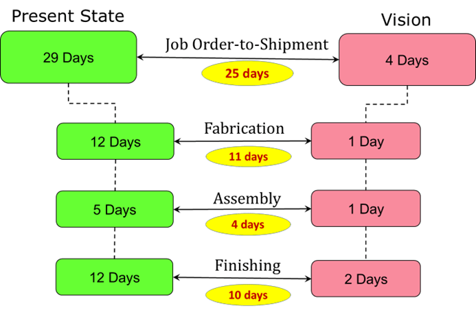 The general manager noted there was a lot of waiting time between production steps and saw that he could narrow down the factory job-order-to-shipment lead time to four (4) days.