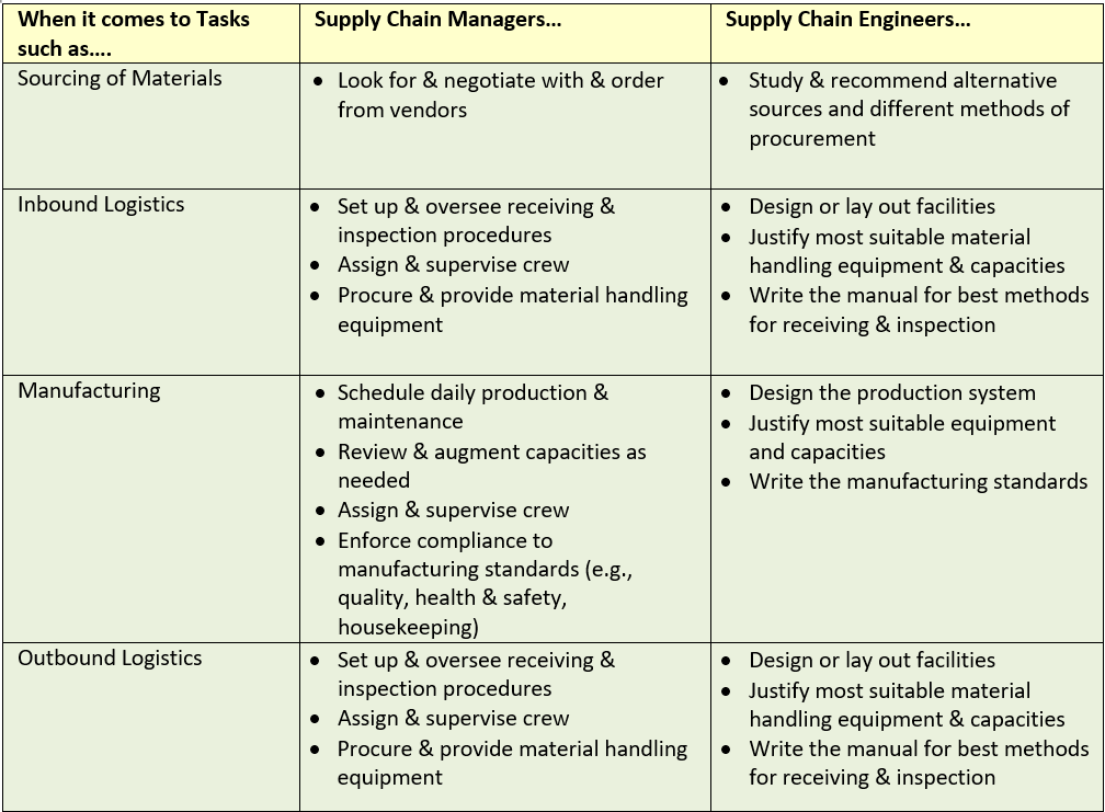 Supply chain engineers, on the other hand, don’t oversee or supervise. They assess the conditions of people, assets, and resources and figure out how to boost the productivities of each and all. Engineers don’t limit themselves to what’s there but instead, study what can be added or changed.