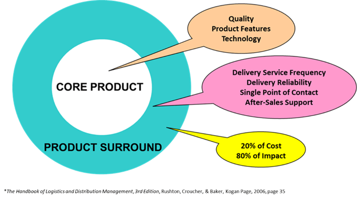 The Surround is how the product is supported or presented, e.g., quality, service, availability, delivery and cost (price).
